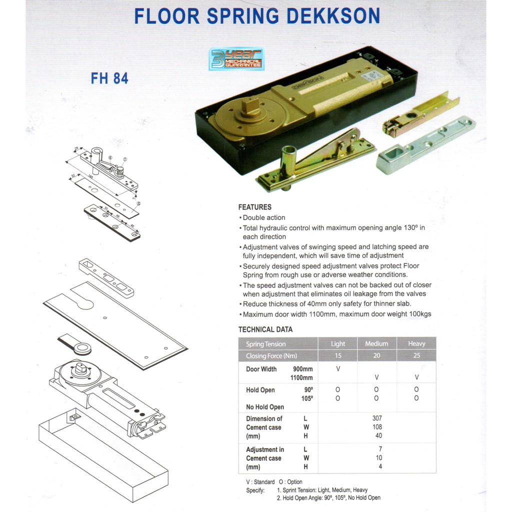 Floor hinge dekkson bts 84 with hold open bisa stop di 90 komplit set plus stang atas bawahmaksimal berat pintu 100kgdengan ukuran pintu 210x90produk bergaransi resmi dekkson.